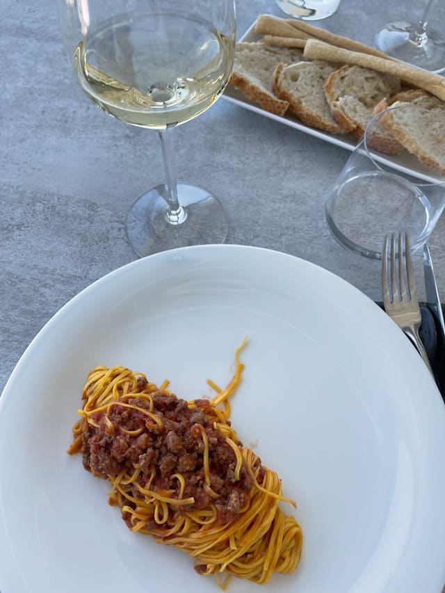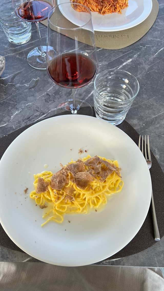 Spaghetti alla chitarra, crema di stravecchio e zafferano, zucchine