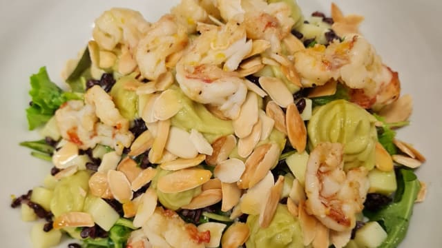 Misticanza, tentacoli di polipo al vapore, passion fruit, croccante ai semi, crema di avocato e lime