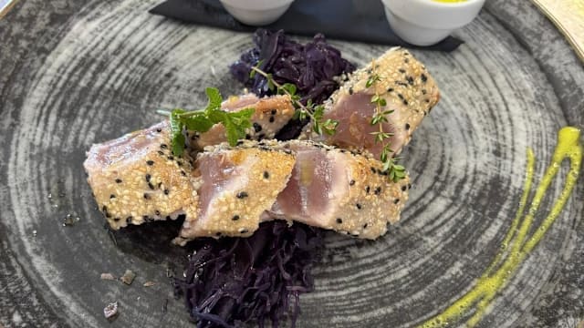 Trancio di tonno su crema di verdure stagionali e salsa wasabi
