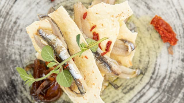 Acciughe alla povera su cialda di pane carasau e cipolle rosse caramellate