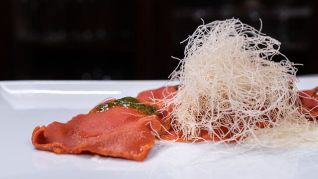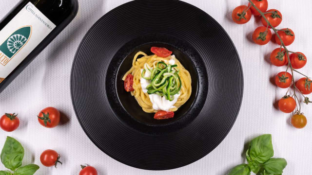 - Spaghetto quadrato burrata, pomodori diversi e reggiano (36 mesi) al basilico