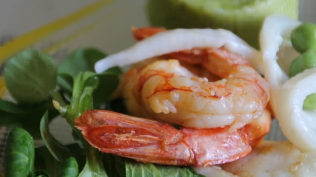 Insalatina di gamberi rossi, spigola e capasanta con taccole, asparagi di mare, coulis di mango e olio alla vaniglia
