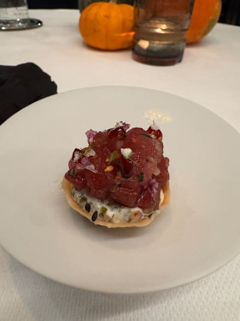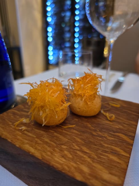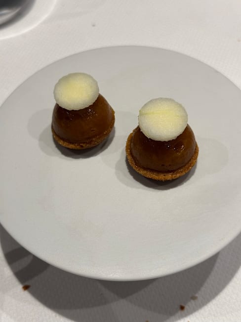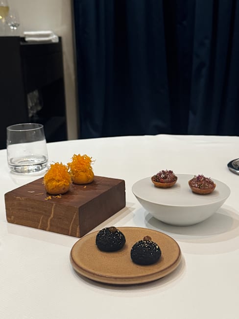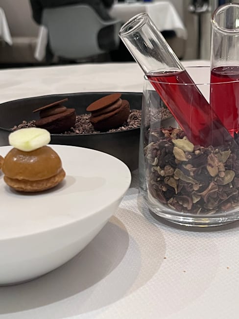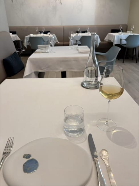 8/10+5Booked via Fork the day before for dinner. Had the 5 course dinner (98€pp). There is an extra canape course and post-dessert course with digestive which was a welcome surprise. Overall food was fantastic (pigeon was our main). Service was impeccable. The room arrangement was a bit unusual with a mix of square and circular tables that we didn't quite understand, otherwise nice and not too noisy.