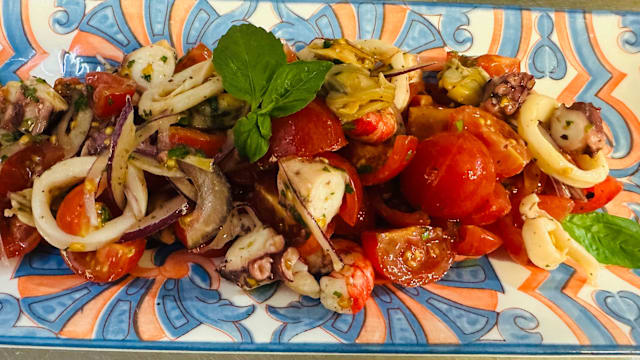 - Cozze, polpo, vongole, pesce spada, gambero rosso, pomodoro ciliegino, salsa di pomodoro fresco, prezzemolo, pepe nero