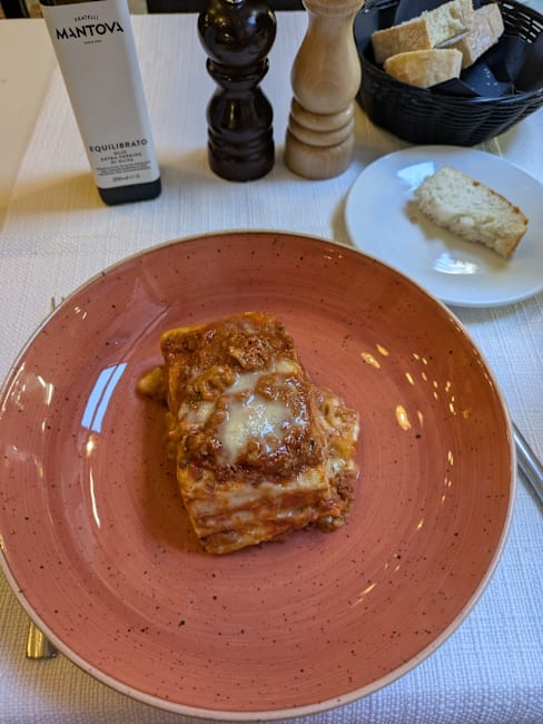8.5/10lasagna was great (although the noodles were slightly overcooked.) Staff did not seem happy to be there. Had to ask for everything cause they didn't offer. Wouldn't give me tap water even though it's safe to drink.