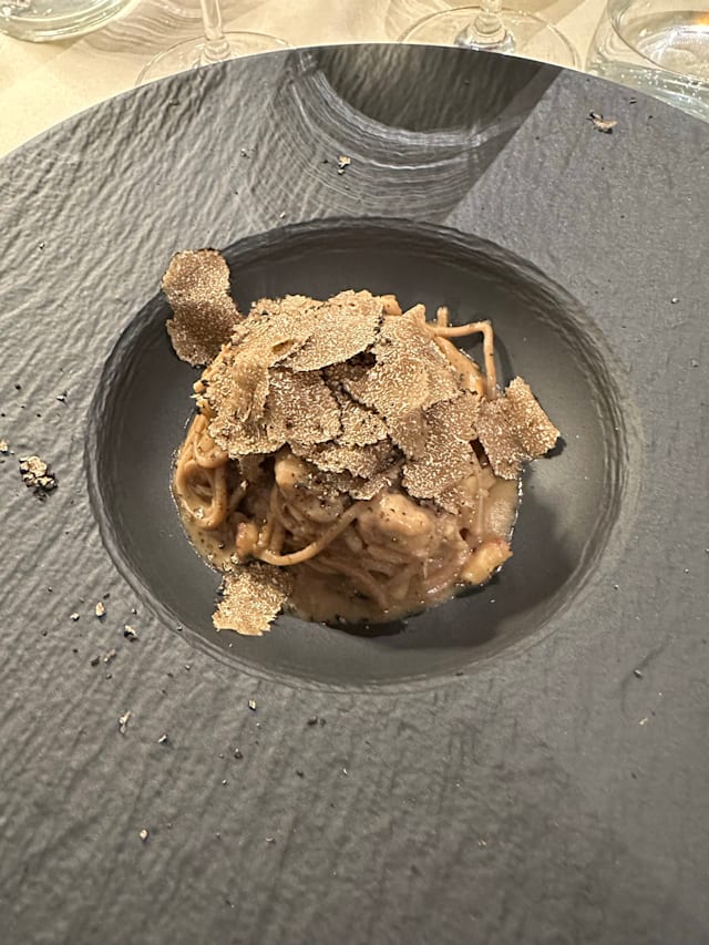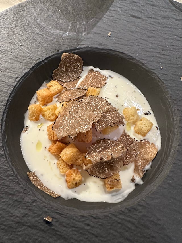 Prodotto dalle nostre galline allevate a terra, cotto a 63’, accompagnato da una crema di cacio e pepe, crostini aromatizzati e tartufo nero.