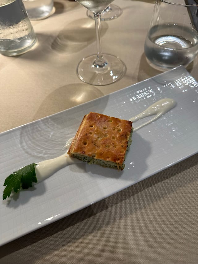 In doppia cottura, croccante all’esterno e morbido all’interno, accompagnato da crema di fagioli cannellini, sedano rapa e crema di burrata.