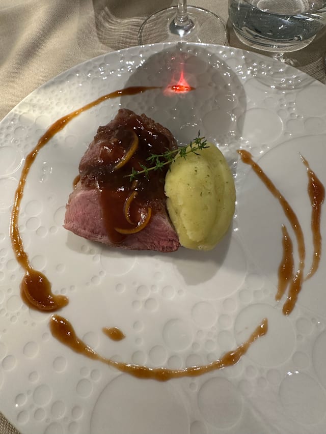 Cotto a bassa temperatura, salsa all’arancio e gin, patate alla provenzale.