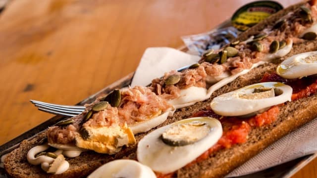 - Jamón curado y tomate triturado con un toque de aceite de oliva
