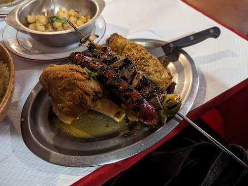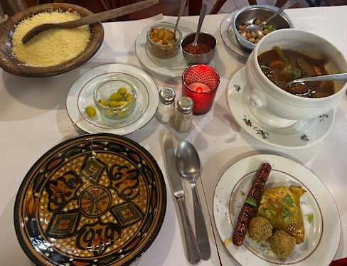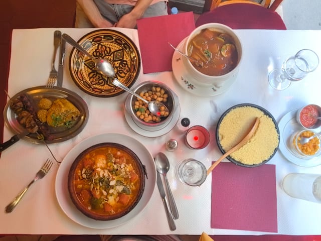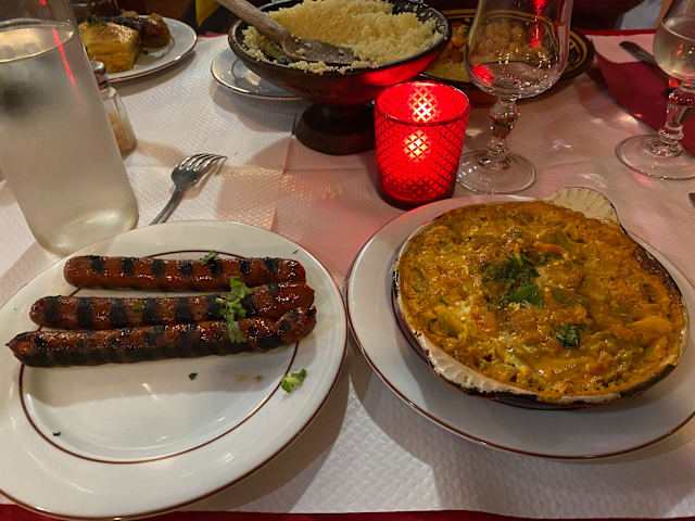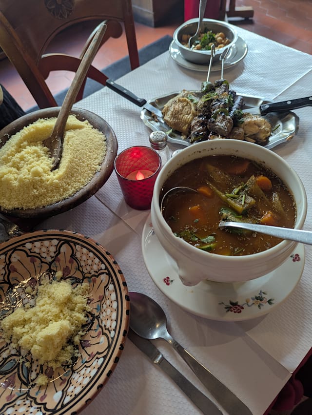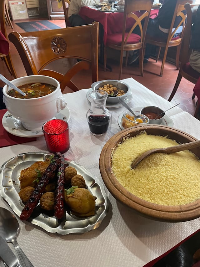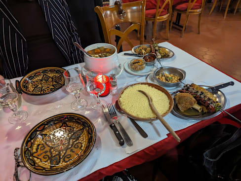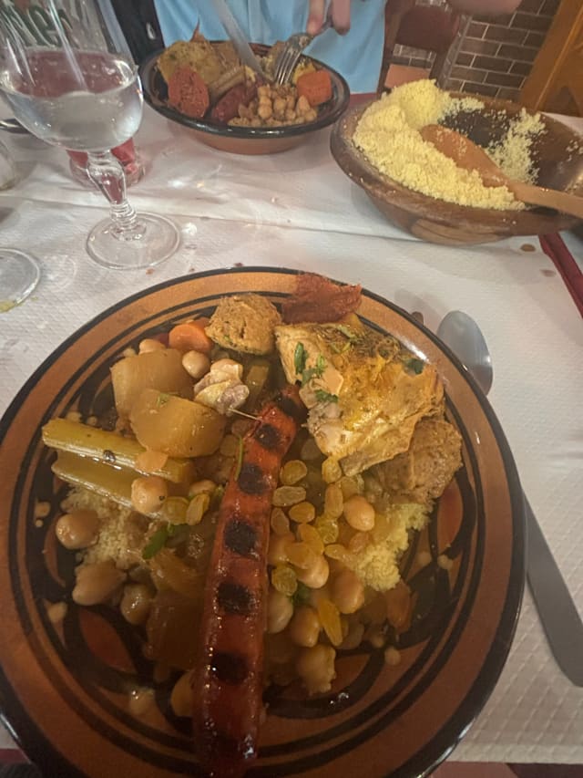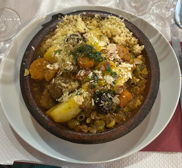 10/10What a great meal - I had the Couscous de la Chef, and it was enough for two people. It was delicious; it included three types of meat - chicken, spicy sausage and meatballs. There was a terrine of vegetables in a wonderful light broth. Plus raisins, a hot mixture and chickpeas rounded out the offering. I look forward to returning to try the Tajine options. The waiter was attentive and friendly. When ordering I asked him if it would be too much food to also have a Starter and he responded that the Couscous would be plenty of food.