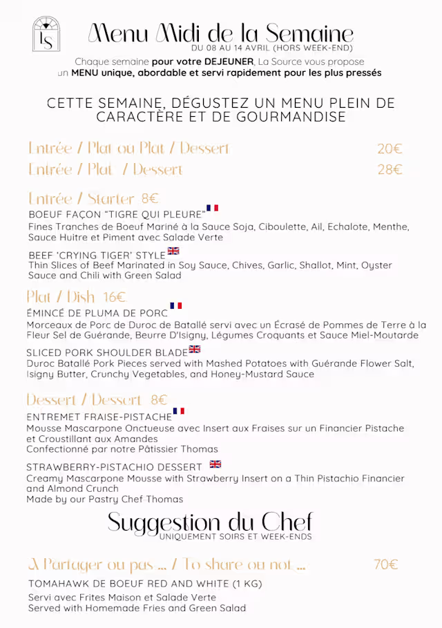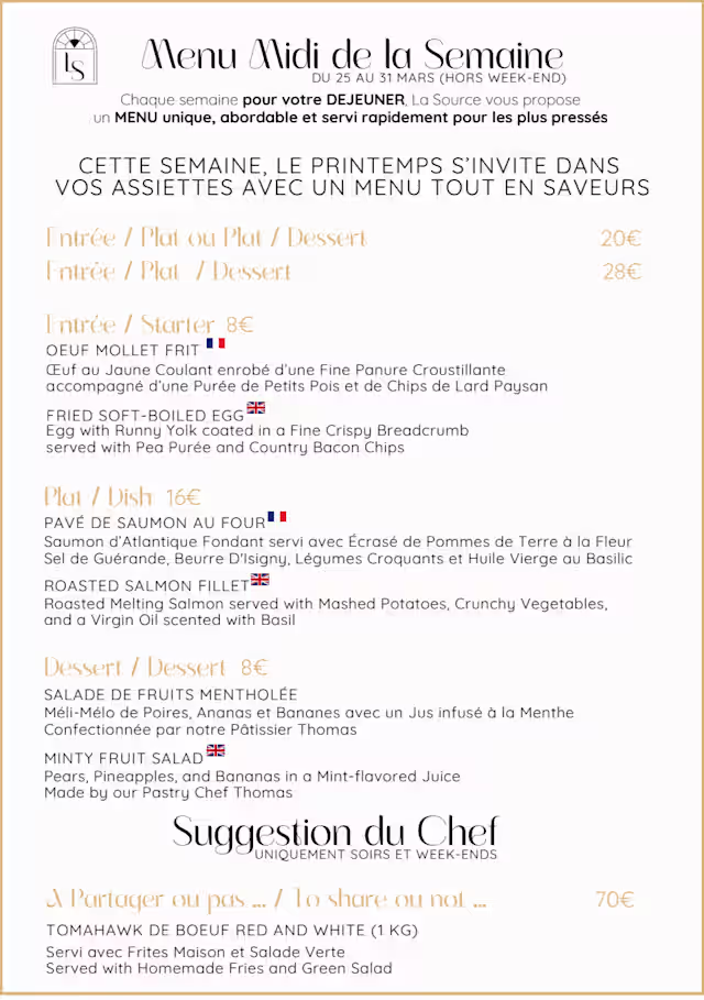We loved our meal at La Source. Everything was fresh, tasty and well-plated. The terrasse is a charming place to enjoy dining, as well. Our waiter was attentive and friendly. We would definitely return.