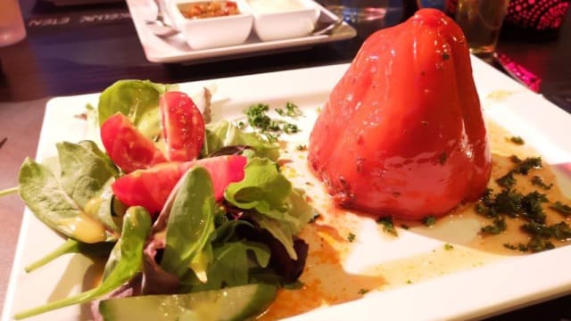 Gevulde paprika met gehakt. Geserveerd met friet, sauzen en salade.
