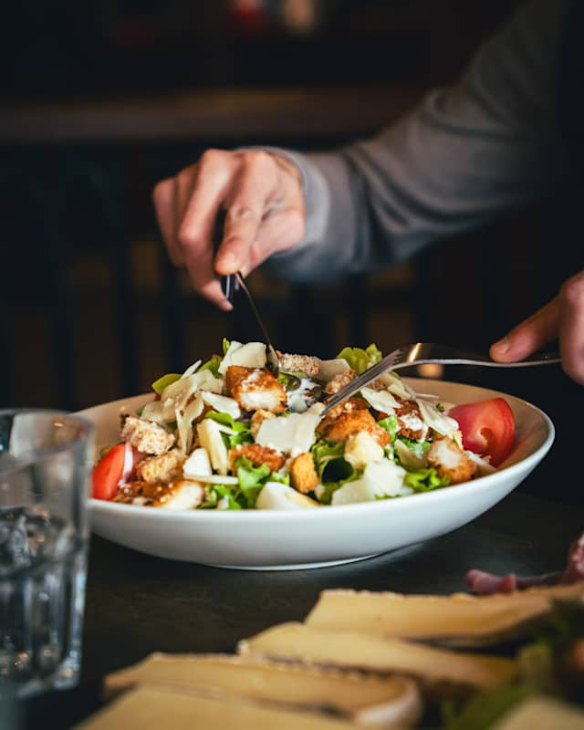 - Suprême de poulet panné, œuf dur, grana, croûtons, salade verte