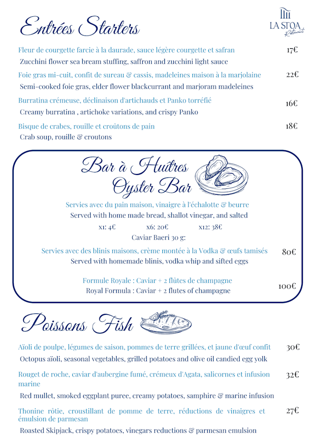 10/10Of all the restaurants we visited during our week stay in Villefranche Sur Mer, La Stoa stood out for their warm greeting, genuine concern for our happiness and, of course, the delicious food! The view was wonderful as well. We are so glad we discovered this jewel!