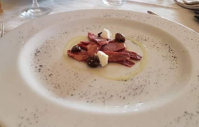 di manzo con olio evo, cristalli di sale e tuiles di Parmigiano