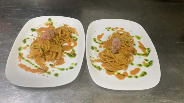 - Con bisque di gambero rosso, stracciatella. Granella di pistacchio, battuto di gambero e citronette al limone