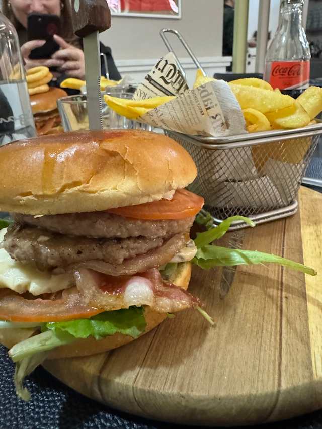 - Pane, hamburger di manzo, cipolle caramellate, garlic sauce, cheese, uovo, bacon, pomodoro e insalata