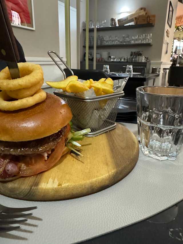 - Pane, hamburger di manzo, bacon, cipolle caramellate, maionese, cheese, pomodoro, insalata e top di onion ring