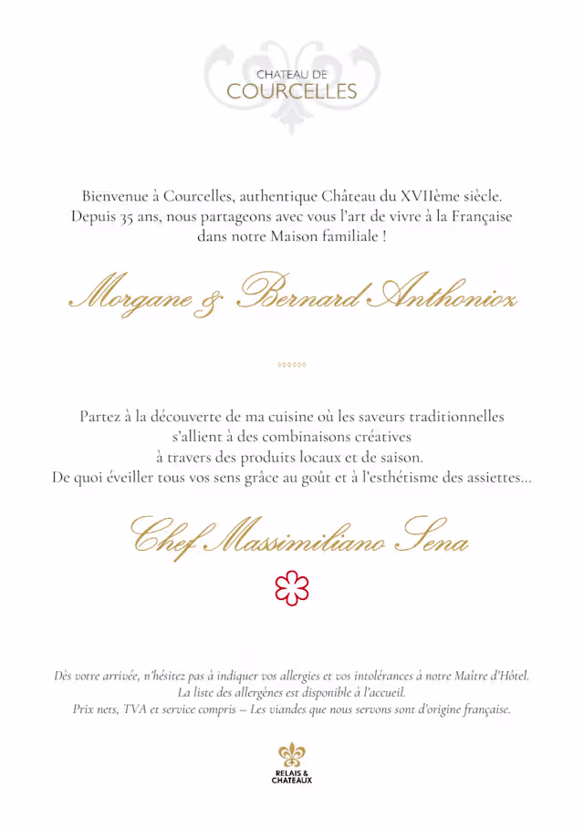 3/10A very disappointing experience, with very slow service, taking three and half hours for a "set menu meal". Served luke warm, partially raw, with tough sinewy meat, by very young bewildered dining room staff. Quoted at €90 per person, and securely by Visa card, we were charged €110 p.p., (a 22.% increase without notice). Chateau de Courcelles said the charge was imposed by Michelin, who we booked the accommodation through, and out of their control. We have sought a refund for the over charge from Michelin, but haven't received a reply. A beautiful property spoilt by a very poor dining room experience and indifferent response from Michelin and management staff at the property. We would not recommend to others unless reassurances can be provided that these fundamental issues have been addressed.
