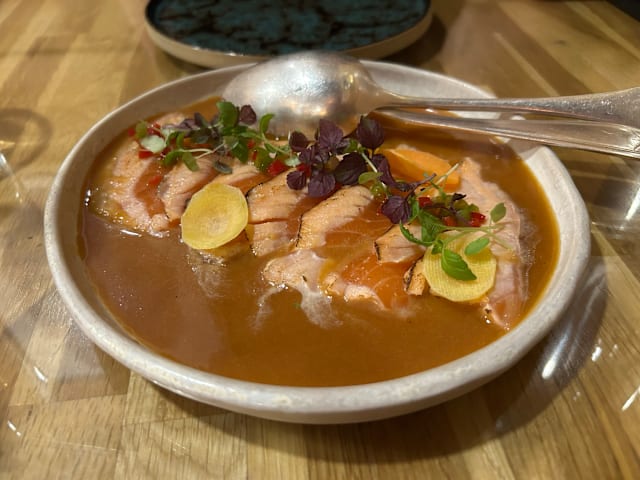 Saumon saisi au chalumeau, sauce yuzu miso, pousses de shiso