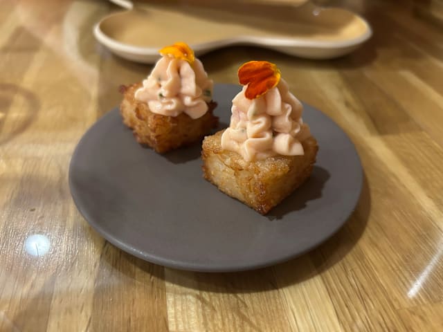 Foie gras mi-cuit, anguille grillée et glacée, sauce jalapeños coriandre