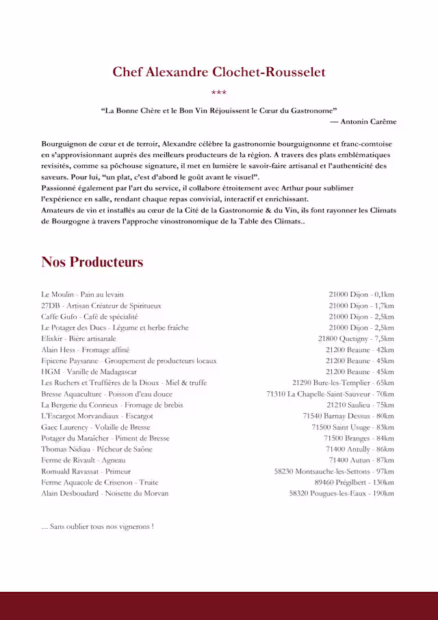 La Table des ClimatsMarylise, Thank you very much for this 10/10 and for your wonderful message. We’re delighted that your experience lived up to that description. Creating a memorable moment, through the cuisine, the atmosphere and the service, is exactly what we strive for every day. We hope to welcome you back very soon for another amazing experience.