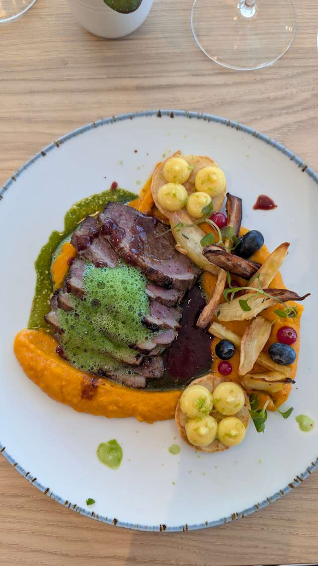 - Mi-cuit de canard, chutney de poire, coulis de passion, tuiles de sarrasin