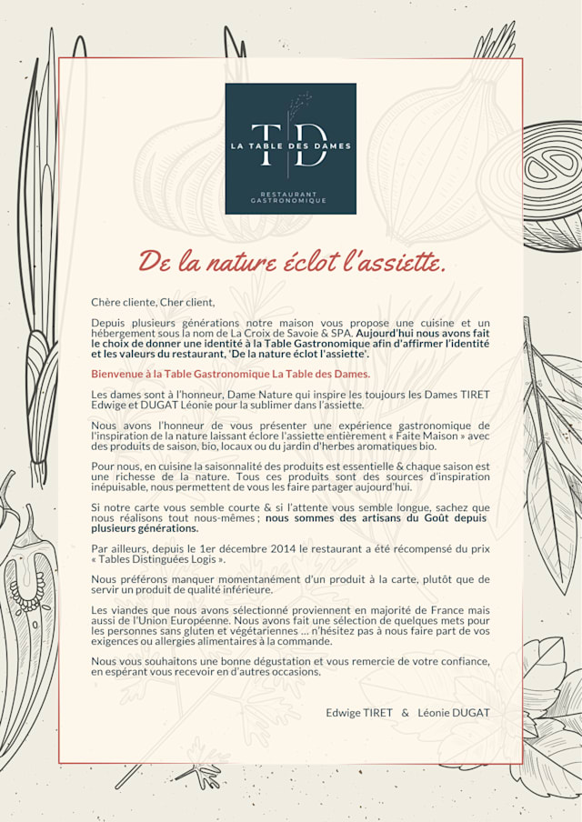 FrenchEuropeanEscargotsFondueSaladContemporary cuisineIn the mountainsOutdoor diningHealthyGluten freeLactose intoleranceLocally producedNut allergiesOrganic foodPeanut allergyDog-FriendlyWheelchair AccessibleWifi
