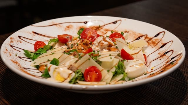 Mélange de salades, tomates cerises, poulet pané maison, oeufs durs, copeaux de parmesan, oignons frits, sauce césar.