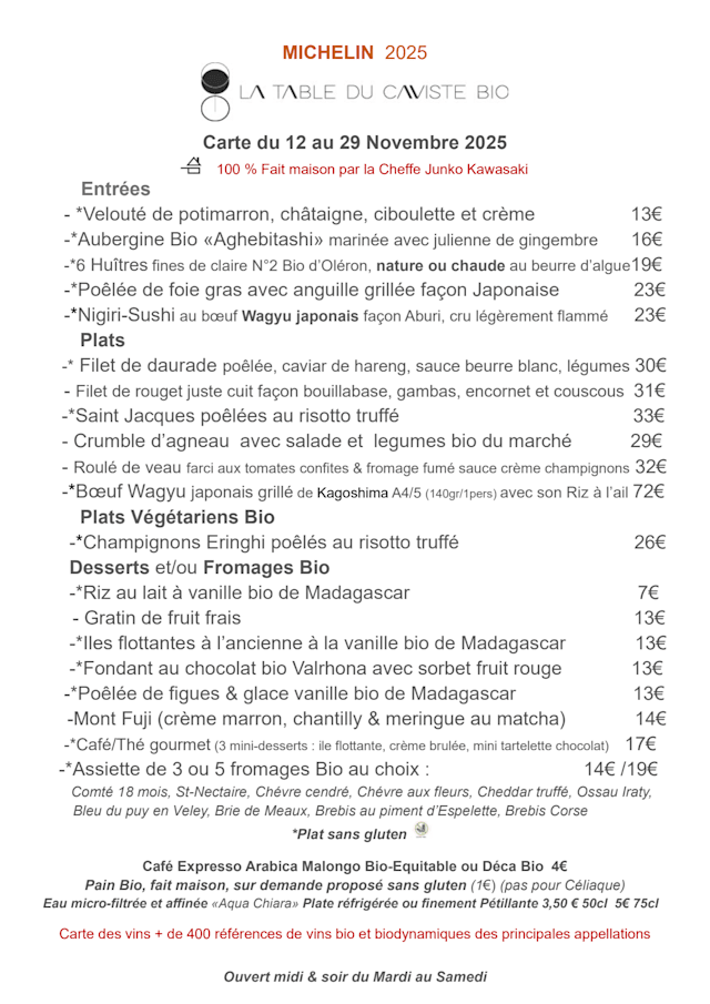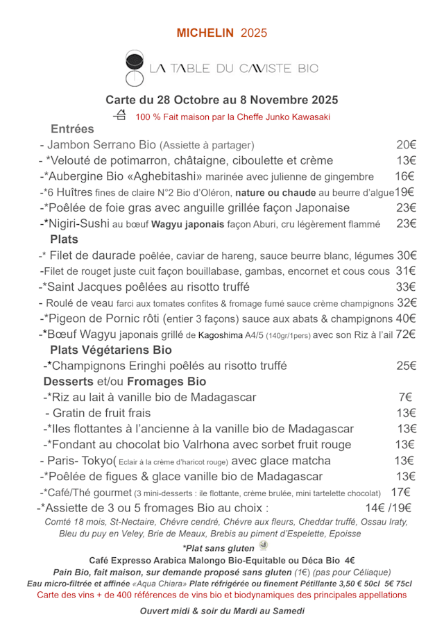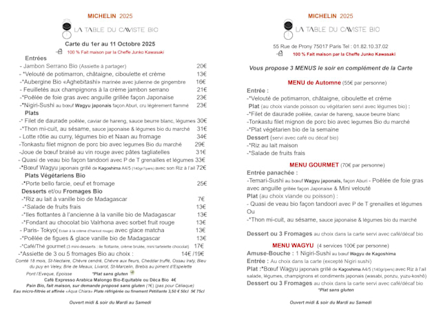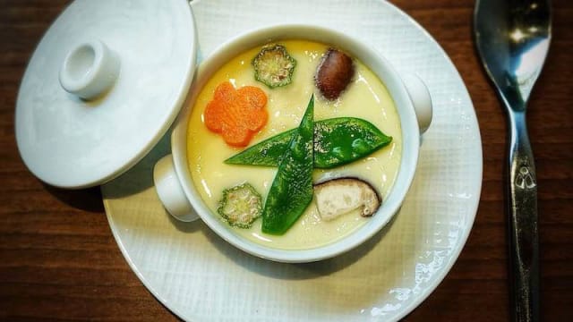 10/10The comprehensive attention to detail was evident in all aspects of our dining experience. The menu was varied and had several "formules" to choose from, as well as a la carte. We chose the Gourmet menu and we were not disappointed. The Wagu sushi was delectable and beautifully presented. His Wagu steak main was cooked to perfection and melted in your mouth, and my scallop and shrimp dish, presented as a gourmet fried roll, cut on the bias was a feast for my eyes as well as my mouth. Most remarkable though, was the perfectly cooked, vibrant vegetables along side. The dish was a good and satisfying portion, but was so good, I wanted more and will come back to have this dish again. The japanese and french fusion truly made this dining experience one to remember. I look forward to making this restaurant a place to return and its now one of my favorites! Although the wine list is a bit esoteric, it is well rounded and well organized with wines in all price ranges for a great pairing.