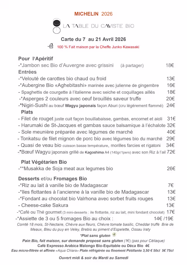 The comprehensive attention to detail was evident in all aspects of our dining experience. The menu was varied and had several "formules" to choose from, as well as a la carte. We chose the Gourmet menu and we were not disappointed. The Wagu sushi was delectable and beautifully presented. His Wagu steak main was cooked to perfection and melted in your mouth, and my scallop and shrimp dish, presented as a gourmet fried roll, cut on the bias was a feast for my eyes as well as my mouth. Most remarkable though, was the perfectly cooked, vibrant vegetables along side. The dish was a good and satisfying portion, but was so good, I wanted more and will come back to have this dish again. The japanese and french fusion truly made this dining experience one to remember. I look forward to making this restaurant a place to return and its now one of my favorites! Although the wine list is a bit esoteric, it is well rounded and well organized with wines in all price ranges for a great pairing.