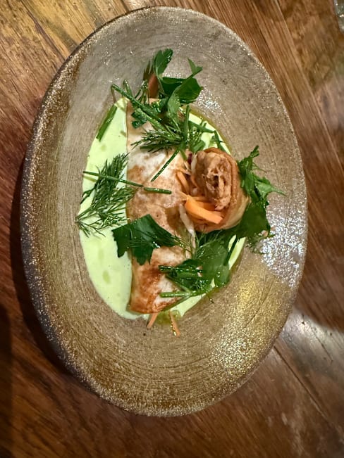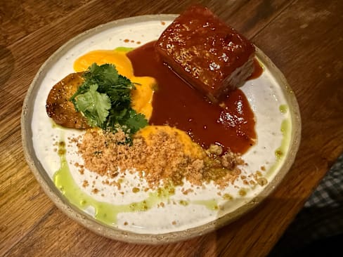 7.5/10The food really was creative and delicious. Really enjoyed the roasted butternut squash with the cold foam and pepitas. The chorizo stuffed squid with cubes of arancini essentially were also incredible. Did enjoy the beef with the potato tart — would personally enjoy more greens/veggies. Overall experience, I do think more could be done to improve the ambiance upstairs. There was a large family at the table next to us with 2 kids with bright iPads. That wasn’t a great date night vibe to start but also the lights were too bright (the one near us was missing the black lightbulb cover so the light was going right in my eye). Also had the bad luck of breaking a wine glass unfortunately. While embarrassing (never done before!), it was a really uneven rough cut wood table, and the glasses were placed on leather coasters. Maybe not the best idea. I’d recommend dimming the lights, including the black piece under each light bulb to diffuse, and more warm, inviting decor upstairs.