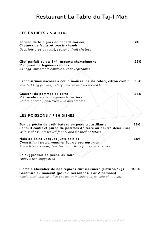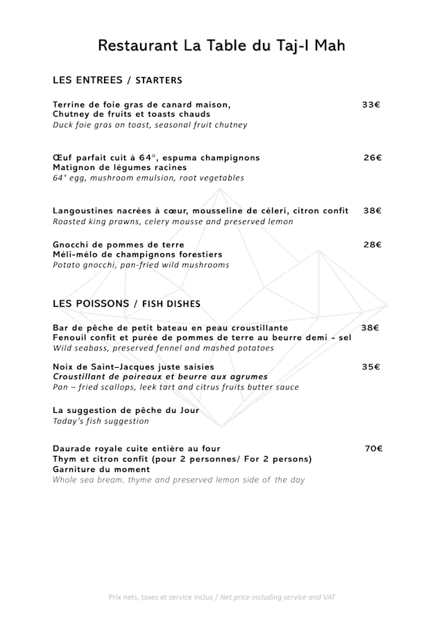 Retrouvez toute l'inspiration de notre chef autour des mets proposés à la table du Taj-I Mah. Une séléction de produit frais, préparés sur place par notre chef et ses équipes de cuisine.