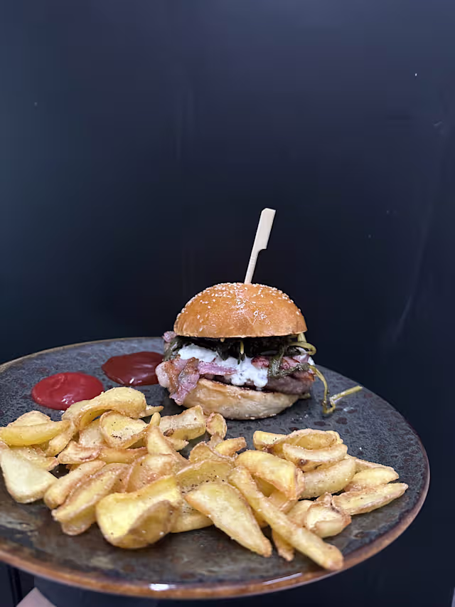 - Hambuger rustico di scottona, funghi, cipolla, provola di bufala affumicata, salsa BBQ