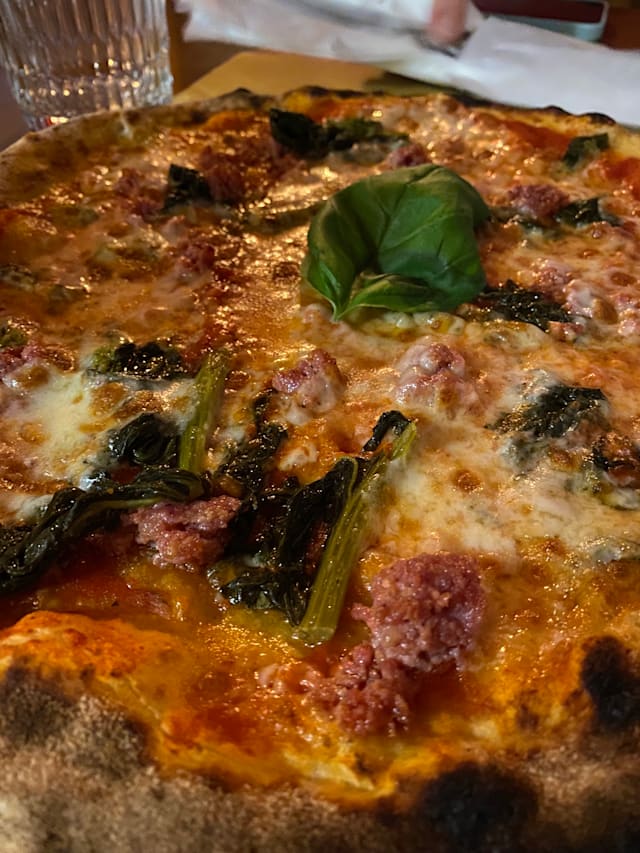 Pom. Fior di latte, salsiccia, patate fritte, peperoni