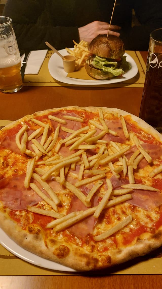 Gorgonzola, pomodorini Fuori cottura speck, rucola, grana scaglie