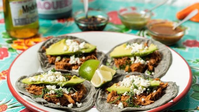 Tacos de tinga de pollo (pollo desmechado en salsa de tomate y chipotle) servidos sobre tortilla de maíz azul y coronados con aguacate, queso fresco, cebolla y cilantro.