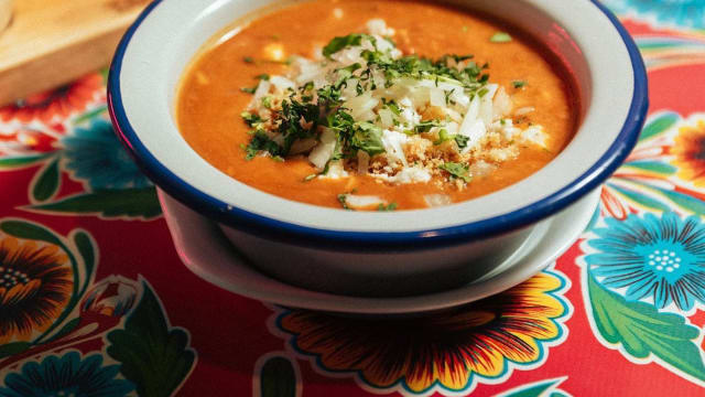 La tradicional sopa azteca con tiras de tortilla crujiente, queso fresco, crema, aguacate y chile pasilla tatemado.