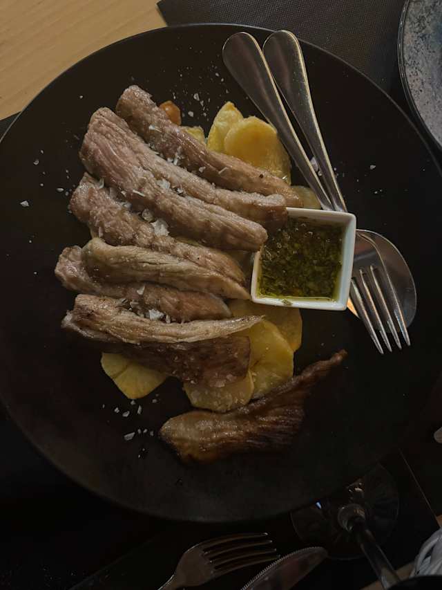 6.5/10The tuna had a great taste and was nicely cooked, but the portions were quite small. The meet wasn't well cooked, I asked for medium rare but it was almost cold in the middle. I like meet really rear so I liked the taste of it, the house red wine was also really good. No one spoke English, and they didn't figure to give us English menu even though the had one. This is a local small jazzy place, we had a nice evening there.