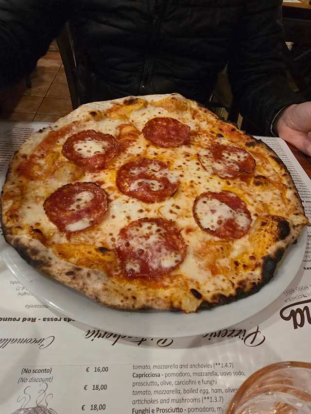 - pomodoro, mozzarella, uovo sodo, prosciutto, olive, carciofini e funghi