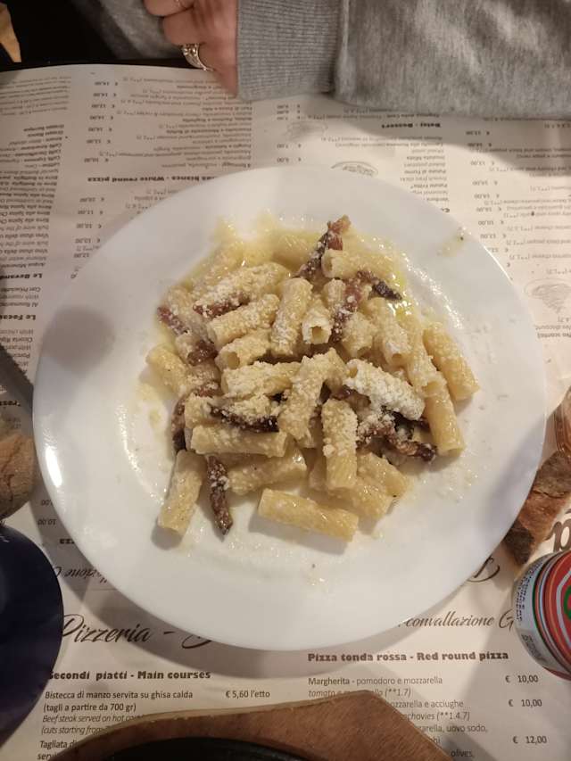 - mozzarella, pomodoro, guanciale, pecorino e pepe