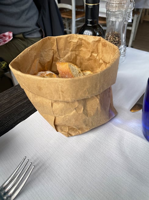 8/10We were given a bread bag to the table and in it was 5 small slices of baguette and inedible hard dried round breadsticks . We were charged €6 for. Definitely not worth that.