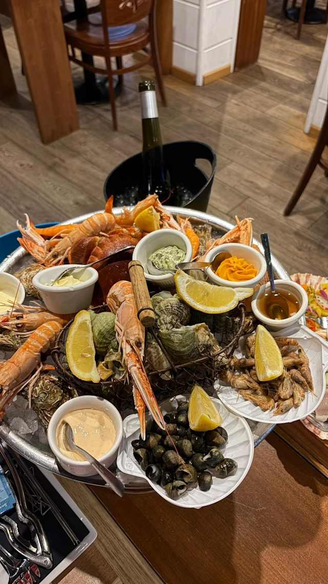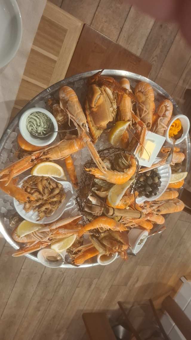 - 1/2 homard, 1 tourteau, langoustines, bulots, bigorneaux, 15 huîtres, crevettes grises, 12 crevettes roses