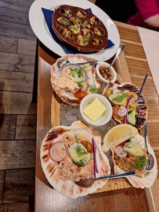 - Assortiment de 7 tapas du bord de mer, suivi d’un mijoté de poisson, risotto crémeux et coquille de saison