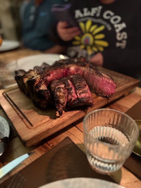 8.5/10My wife and I have been to Firenze many times, but I’ve never had Florentine Steak. So we made a special effort during our stay, and because of the great reviews, and the 20% discount from The Fork, we went for an early dinner at 1800. While the steak was perfectly cooked, and well seasoned, I can’t say that it was worth over 100 Euros. Eros, our waiter couldn’t have been better. My wife had the burger, and after sending it back to get it to medium rare, it was delicious. My sautéed garlic spinach was the best part of my meal. Initially, the lighting was too bright, but around 7, they dimmed the lighting, and placed a real candle on our table, so it went from cafeteria ambience, to first date romantic. We probably won’t return. Not because it wasn’t good, but because I enjoy a 10 Euro AVPN Neapolitan pizza more than a 100 Euro Florentine steak.