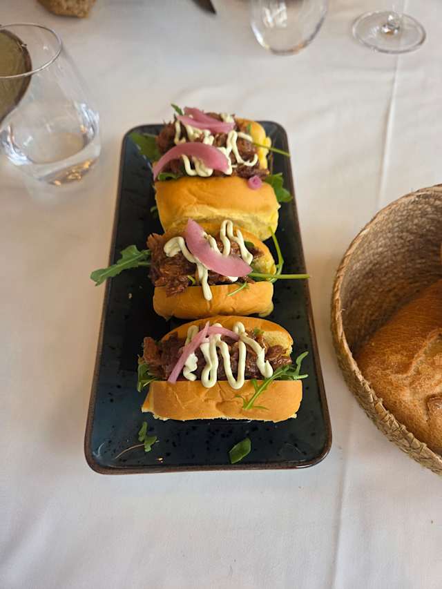 - Brioche de costilla a baja temperatura con mayonesa de aguacate, rúcula y cebolla encurtida.