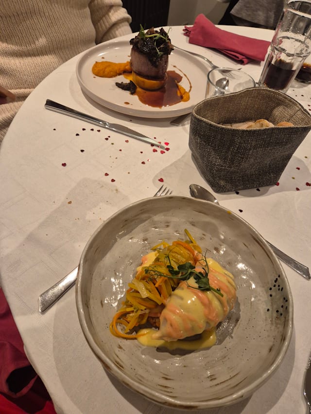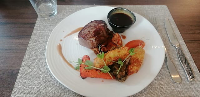 8.5/10The food and the service were excellent. I get a bit bored of Swiss restaurants who think an unchanging menu of fillet de perche et de boeuf is sufficient. This was a way more imaginative menu and well cooked. We had the fish and the lamb as mains. The only drawback is the room which is very much a hotel dining room. The terrace looked great for summer. A pleasant evening.