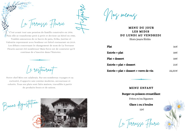 9.5/10Our first time at La Terrasse Fleurie - but I can guarantee that there will be many more. Among us, we had green salad or gravlax as an entrée, steak tartare or trout for the main course and chocolate/caramel tart or fruit cheesecake for dessert. Without exception, they were delicious, the ingredients were of top quality and each plate prepared with love! The service was impeccable (attentive, friendly) and sitting out on the courtyard a delight. I strongly suspect this will become our favourite new haunt!