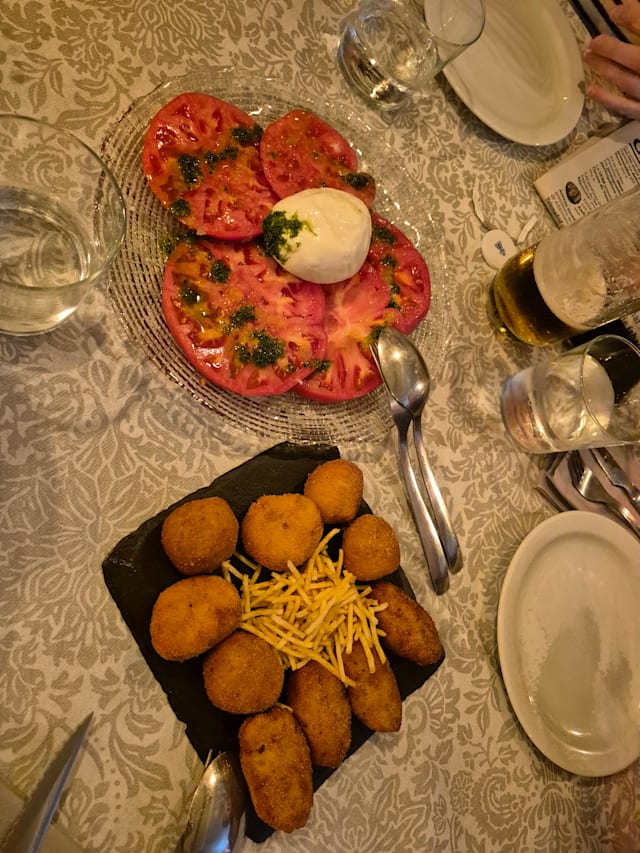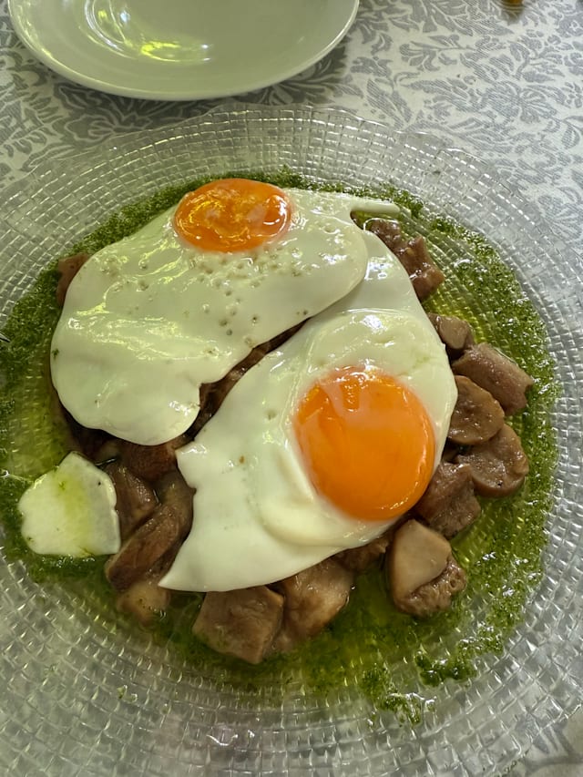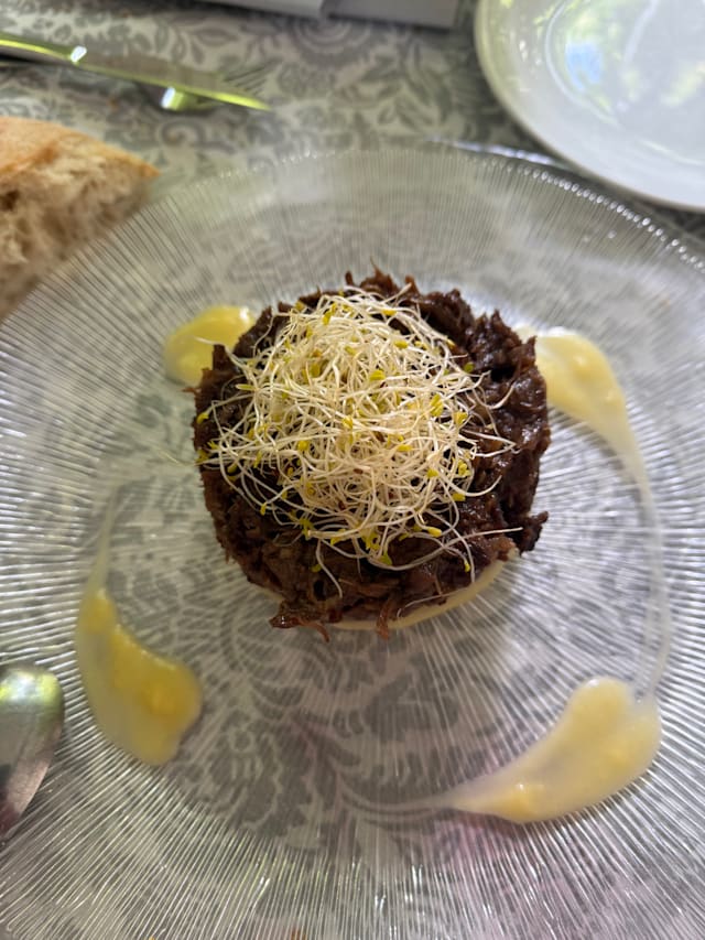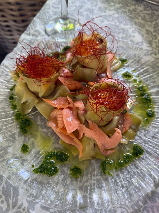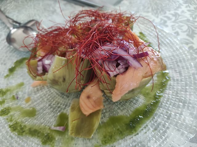 Alcachofas confitadas con huevo asado y salmón o con cecina y cebolla o con salsa de foie