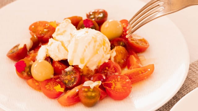 - De tomate cherry ecológico con helado de aceite y esferas de aceitunas